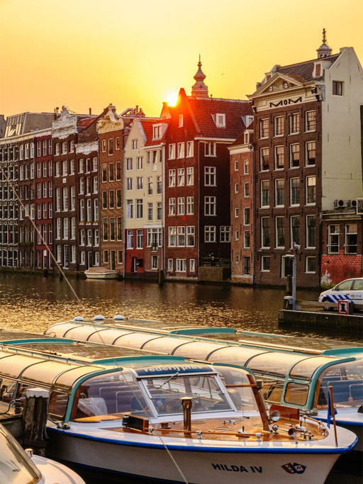 Asmterdam Gracht im Abendlicht Das Bild zeigt ein malerisches Amsterdamer Grachtenpanorama bei Sonnenuntergang, mit traditionellen Häusern, die si...