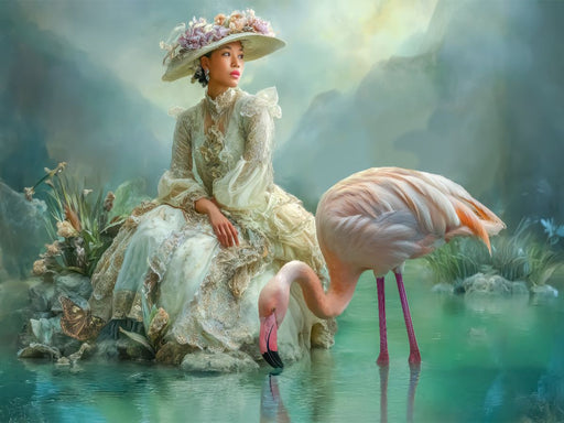 Wunderschöne Frau mit Flamingo Eine kreative malerische Welt von märchenhaften Geschichten erwartet Sie. Eine träumerische Farbpalette verleiht de...