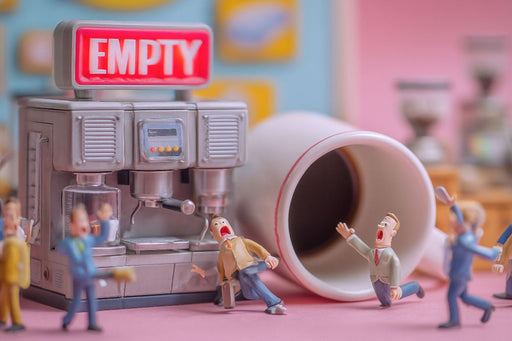 Humor im Büro – Wenn Sprüche zu Bildern werden Eine Gruppe von Bürofiguren steht entsetzt vor einer streikenden Kaffeemaschine. Die Störung im Ver...