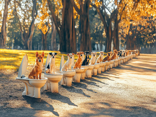 Dieses außergewöhnliche Hundepuzzle zeigt eine ganze Reihe braver Vierbeiner, die in perfektem Gleichschritt auf der Toilette sitzen Ein Bild wie ...