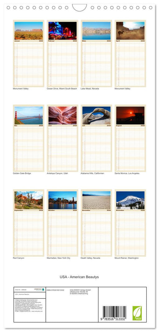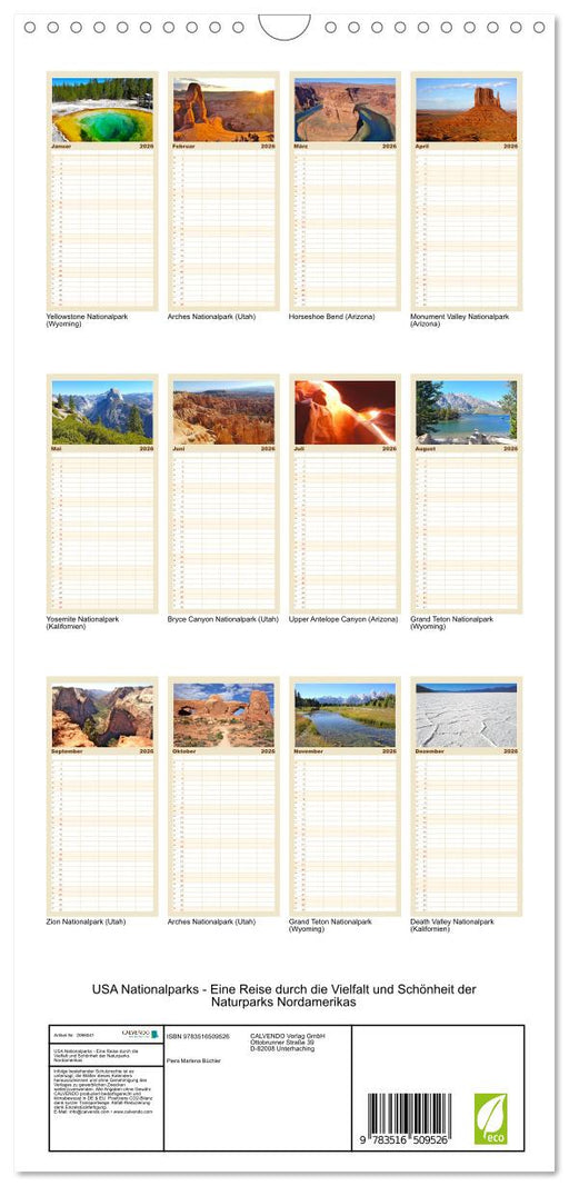 Afficher tous les détailsUSA Nationalparks - Eine Reise durch die Vielfalt und Schönheit der Naturparks Nordamerikas (CALVENDO Familienplaner 2026)