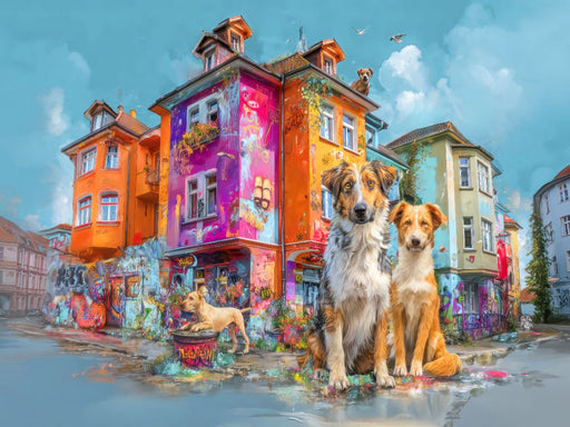 Strassenhunde Tauchen Sie ein in eine charmante Stadt mit KI-generierten Alltagsszenen. In liebevoll gezeichnetem Stil begegnen Ihnen tierische Be...