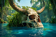 Tief in einer versteckten Meeresgrotte liegt ein halb versunkener Riesenschädel im kristallklaren, türkis leuchtenden Wasser. Korallen und Seeanemonen haben sich über die Schädeldecke gelegt, während bunte Fische durch die offenen Kiefer schwimmen. Lichtstrahlen durchbrechen das Wasser von oben und tanzen auf dem Knochen, wodurch eine surreale, fast friedlich-mystische Atmosphäre entsteht.