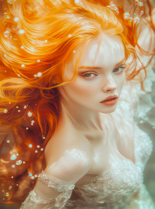 Mit wallendem rotem Haar Lass dich von unseren KI-generierten Kunstwerken verzaubern, die die Schönheit und Anmut der faszinierenden Meerjungfraue...
