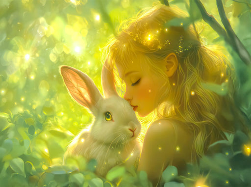Ein Mädchen und ein Kaninchen Magische Begegnungen sind eine Reise in die Fantasie! Lass dich von unseren zauberhaften, von der KI erzeugten Kunst...