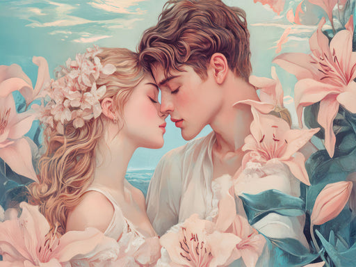 Mit Blumen umwickeltes Liebespaar Tauchen Sie ein in eine Welt voller Träume und Phantasie. Ob Menschen oder Tiere - am Wasser spielen sich zarte,...