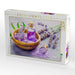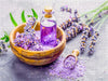 Ein duftiges Puzzle-Motiv und Leinwandbild aus dem Kalender „Im Duft des Lavendels – Mit Achtsamkeit durchs Leben“. Ein kleines Fläschchen Lavendelöl liegt eingebettet in einer Holzschale, dekoriert mit frischen Blüten.