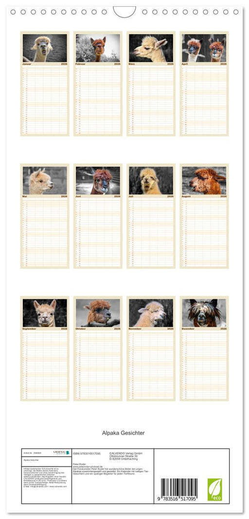 Afficher tous les détailsAlpaka Gesichter (CALVENDO Familienplaner 2026)