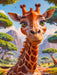 Das Bild zeigt eine super niedliche Giraffe mit riesigen, funkelnden Augen, die voller Neugier und Sanftheit strahlen. Ihr kleiner, runder Kopf mit den flauschigen Hörnchen und das sanfte Lächeln verleihen ihr einen besonders liebenswerten Charme. Mit ihrem gepunkteten Fell und dem verspielten Blick sieht sie aus wie eine Figur aus einem süßen Cartoon.