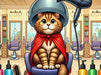 Perfekter Style für jede Samtpfote. In unserem Salon verwandeln wir jede Mieze in einen Star. Entspannung, Pflege und Glamour - Ihre Katze hat es verdient. Das KI generierte Motiv zeigt eine Katze in absurder Situation und unerwarteter Kombination, die zum Schmunzeln bringt. Ein Motiv, der das schräge und lustige unterstreicht und Ihnen ein Lächeln ins Gesicht zaubert. Ein Schmunzelbild aus dem KI Kalender Lachalarm total tierisch - Was ist hier denn los?