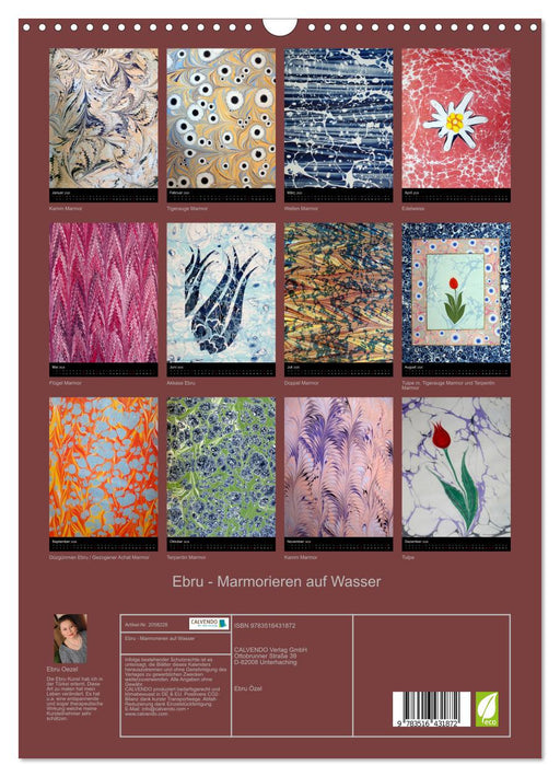 In diesem Kalender werden Ihnen 12 verschiedene Stile der Ebru Kunst präsentiert. (Monatskalender, 14 Seiten) Ebru ist die Kunst des Marmorierens ...