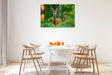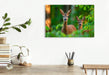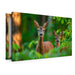 Premium Textil-Leinwand Eine Rehgeiß steht mit ihrem Kitz im grünen Frühlingswald und blickt aufmerksam durch das frische Laub.