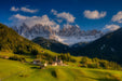 Eine Dolomitenszene wie aus dem Bilderbuch für Ihr Zuhause. Im Vordergrund ein malerisches Bergdorf mit einem charmanten Kirchlein, eingebettet in sanfte Wiesen und dichte Wälder. Dahinter erhebt sich eine atemberaubende Kulisse schroffer, angezuckerter Gipfel, die die Erhabenheit der Natur eindrucksvoll widerspiegeln. Die Komposition aus unberührter Landschaft und traditioneller Architektur vermittelt Ruhe, Geborgenheit und eine tiefe Verbindung zur Natur. Ein Bild, das Sehnsucht weckt und Ihrem Raum alpine Eleganz verleiht.