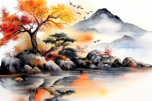 Tauchen Sie ein in die faszinierende Welt der traditionellen japanischen Landschaftsmalerei. Das Bild ist ein Meisterwerk der Ruhe, Gelassenheit ...
