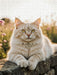 Diese Maine Coon Katze ruht entspannt auf einer Mauer und wird von warmem Sonnenlicht umgeben. Das helle, seidige Fell und die leuchtenden Augen unterstreichen ihre besondere Eleganz und Ruhe. Inmitten einer sommerlichen Naturkulisse entsteht ein Bild voller Harmonie, Gelassenheit und Schönheit, das Katzenfreunde wie Tierliebhaber gleichermaßen anspricht. Dieses Motiv fängt die einzigartige Ausstrahlung der Maine Coon ein und bringt natürliche Wärme in jeden Raum. Bild mit KI generiert.