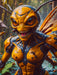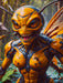 Das Portrait zeigt ein groteskes Mischwesen, dessen Gesicht eine entstellte Mischung aus menschlichen Zügen und hornissenartigen Merkmalen ist: glühende Facettenaugen ersetzen die menschlichen, und ein schwarzer, glänzender Chitinpanzer zieht sich über die deformierte Haut. Aus dem Mund ragt ein scharfer, tödlicher Stachel, während die düstere Atmosphäre durch dramatisches Schattenlicht und einen Hintergrund aus bedrohlich verzerrten Flügelspiegelungen verstärkt wird.