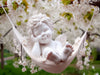 Ein kleiner Engel ruht in einer zart geschmückten Hängematte, umgeben von blühenden Kirschbäumen und dem Duft des Frühlings. Mit einem Lächeln auf den Lippen und der Hand am Gesicht scheint er ganz im Frieden zu sein – ein Sinnbild für Gelassenheit, Unschuld und das stille Glück des Augenblicks.
