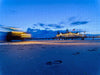 Geheimnissvolle Lichtspuren an der beleuchteten Seebrücke in Heringsdorf auf Usedom zur Blauen Stunde. Im Zentrum des Bildes befindet sich eine Seebrücke, die in das Meer ragt. Die Brücke ist beleuchtet und die Lichter spiegeln sich im Wasser. Am Ende der Brücke befindet sich ein Gebäude, das ebenfalls beleuchtet ist. Auf dem Gebäude wehen Flaggen. Am linken Rand des Bildes ist eine Bewegung zu sehen, die durch die lange Belichtungszeit der Kamera verursacht wurde. Es ist wahrscheinlich ein Fahrzeug oder eine Person, die sich in Bewegung befindet.