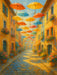 Dieses Bild entführt uns in eine märchenhafte Gasse, in der bunte Regenschirme wie tanzende Wesen durch das Sonnenlicht schweben.