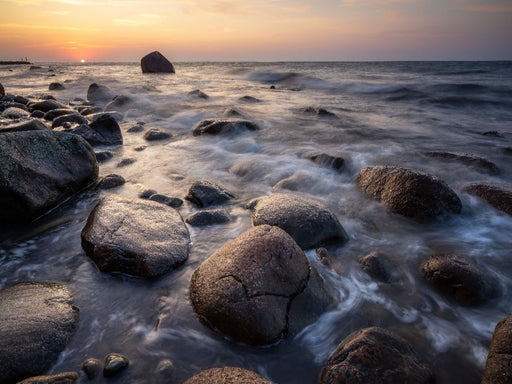 Vor der Küste Rügens liegt der markante Schwanenstein bei Lohme, ein Findling aus der letzten Eiszeit. Im Licht des Sonnenuntergangs färbt sich d...