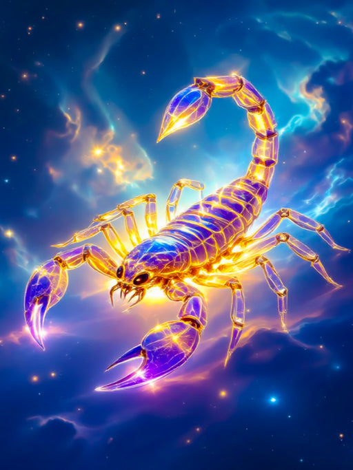 Der Mythos der Sternenzeichen - Sternenwesen des Zodiaks Ein leuchtender Skorpion aus Glas und Sternenstaub kriecht durch eine helle Nebelwolke. S...