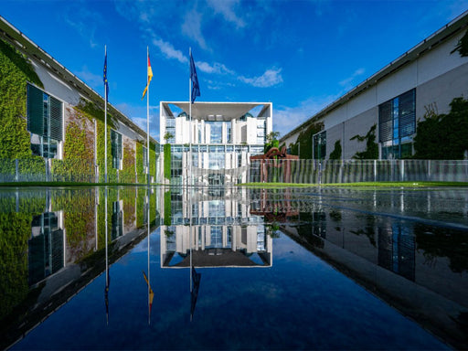 Bundeskanzleramt nach dem Regen Nach dem Regenschauer erstrahlt das Kanzleramt im goldenen Sonnenlicht. Die Spiegelung im Wasser lässt das Machtze...
