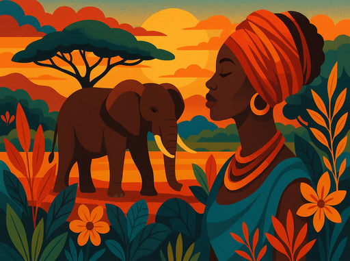 Ein ausdrucksvolles Afrika-Motiv voller Ruhe und Stärke – eine stolze Frau in leuchtenden Farben steht im Einklang mit der Natur, während im Hinte...