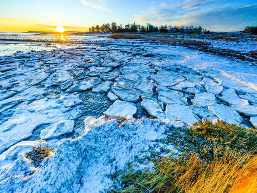 Eisschollen im Watt bei Nebel Winter auf der Nordseeinsel Amrum im Wattenmeer. Tiden formieren die Eisschollen im Watt zu einer einzigartigen Land...