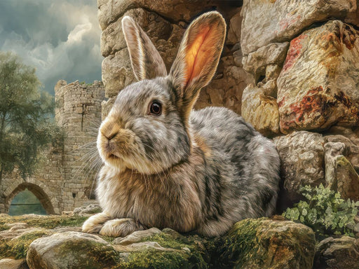 Ein Kaninchen bei den Felsruinen sitzend Erleben Sie ki-generierte Werke von niedlichen Kaninchen, eingefangen in kunstvollem Realismus. Für alle ...