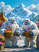 Mehrere Yetis pflücken leuchtende Frostbeeren von eisigen Büschen. Große Körbe sind bereits voll mit bunten Früchten, während kleine Yetis heimlich naschen. Das warme Licht der Herbstsonne taucht die Schneelandschaft in ein goldenes Schimmern.