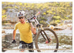 April: Radler trägt sein Mountain Bike in unwegsamen Gelände über einen Fluss