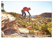 Mai: Mountain Biker nimmt die Herausforderung an und springt von einem Felsen, Grand Junction, Colorado