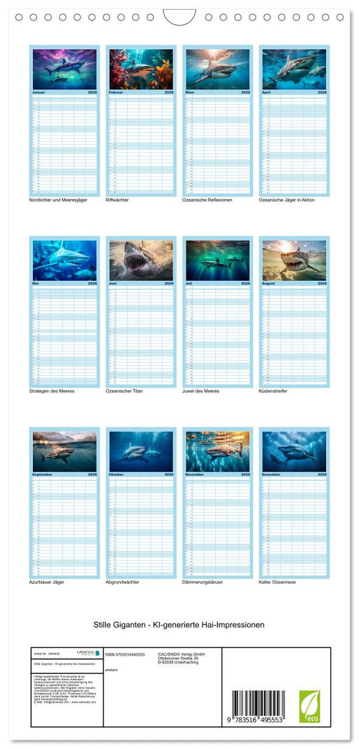 Afficher tous les détailsStille Giganten - KI-generierte Hai-Impressionen (CALVENDO Familienplaner 2026)