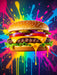 Ein klassischer Cheeseburger wird zur Kunstikone: goldene Brötchen, geschmolzener Käse und kräftige Saucen in Nahaufnahme. Der Hintergrund pulsiert in pinken und blauen Lichtern, fast wie ein Feuerwerk. Ein Symbol für Genuss, Urbanität und pure Lebensfreude.