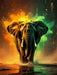 Ein mächtiger Elefant erhebt sich in einem Regen aus Gold, Orange und Smaragd. Seine Silhouette scheint aus Licht und Farbe geformt. Er steht für Beständigkeit, Weisheit und die ruhige Macht der Natur.