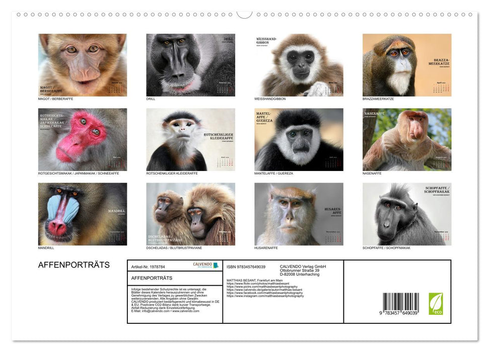 Der Tierfotograf Matthias Besant porträtiert in seinem neuesten Fotokalender besondere und schöne Affenarten Afrikas und Asiens. Sie sind in der Natur größtenteils bedroht und gehören zur Familie der Meerkatzenverwandten, darunter Meerkatzen, Makaken, Paviane und andere. Der Kalender bietet eine faszinierende Zusammenstellung der verschiedenen, vielfältigen Affenarten und ist ein ideales Geschenk für alle Tierliebhaber. Dieser qualitativ hochwertige Kalender gehört zur exklusiven CALVENDO Gold-Edition.