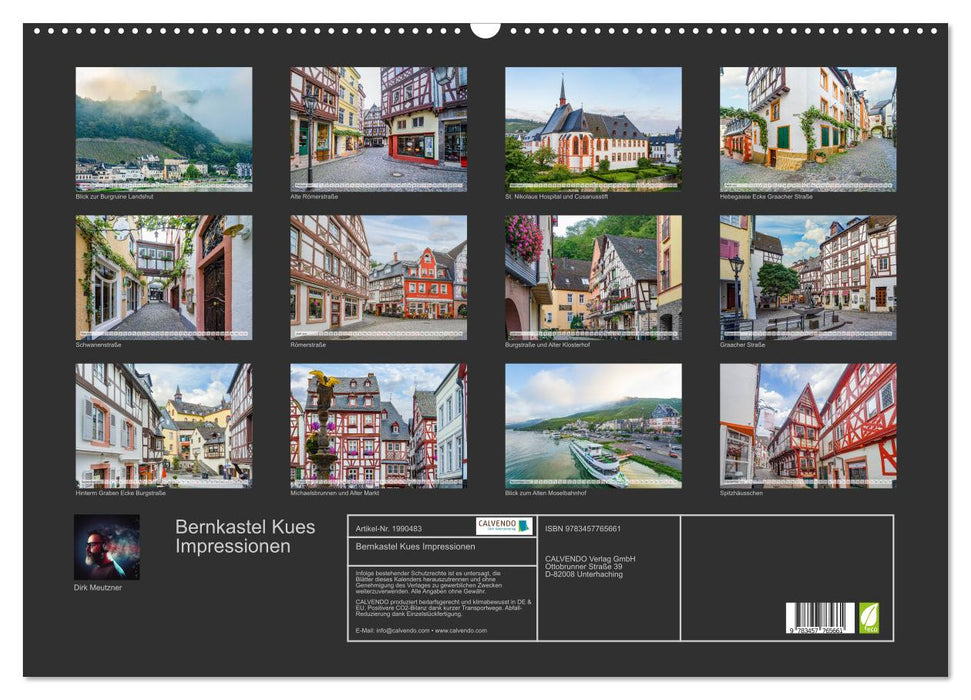 Die Stadt Bernkastel-Kues dargestellt auf zwölf einzigartig farbenprächtigen Aufnahmen des Fotografen Dirk Meutzner. Dieser Kalender wird Sie Monat für Monat mit seinen Bildern verzaubern. Bernkastel-Kues ist eine verbandsangehörige Stadt an der Mittelmosel im Landkreis Bernkastel-Wittlich, Rheinland-Pfalz. Sie ist staatlich anerkanntes Heilbad, Sitz der Verbandsgemeinde Bernkastel-Kues sowie des Dienstleistungszentrums Ländlicher Raum Mosel und Geburtsort des mittelalterlichen Kirchenmanns und Philosophen Nikolaus von Kues.