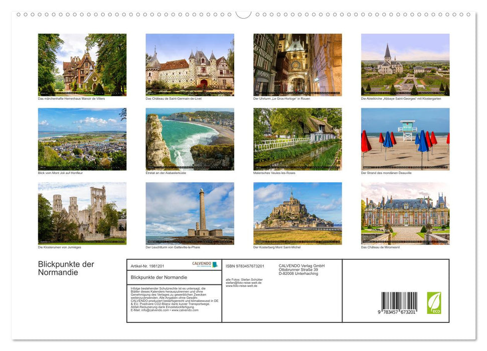 Die Bilder dieses Kalenders zeigen die Normandie von ihrer schönsten Seite. Die malerische Küste, zahlreiche Schlösser und Herrenhäuser, verwunschene Klosterruinen und kleine Dörfer mit historischen Fachwerkhäusern gehören zu diesem Teil Frankreichs. Nicht zu vergessen natürlich der legendäre Mont Saint-Michel.
