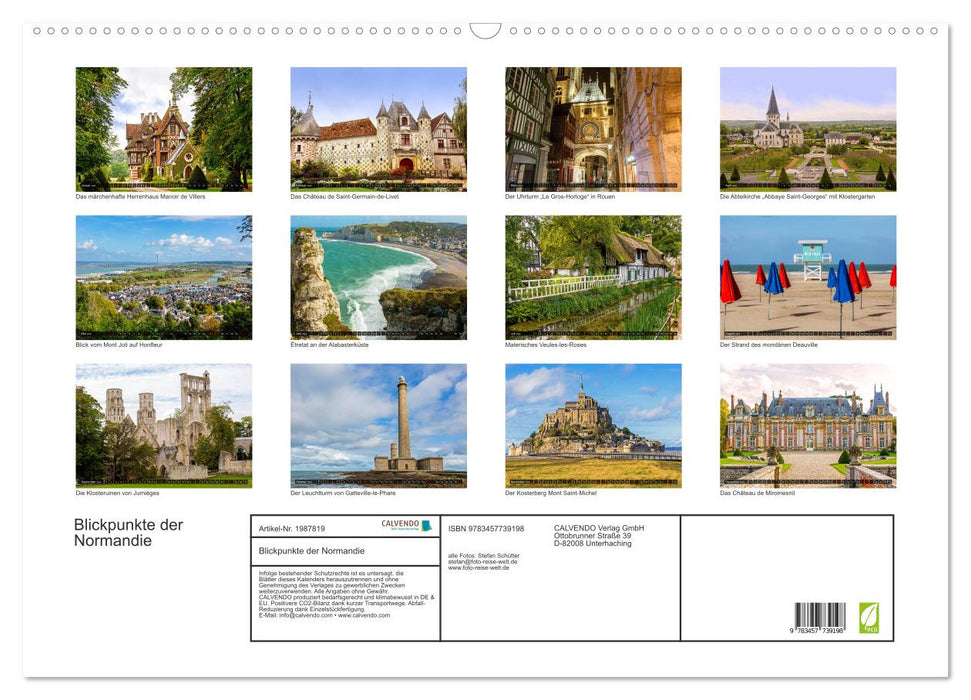 Die Bilder dieses Kalenders zeigen die Normandie von ihrer schönsten Seite. Die malerische Küste, zahlreiche Schlösser und Herrenhäuser, verwunschene Klosterruinen und kleine Dörfer mit historischen Fachwerkhäusern gehören zu diesem Teil Frankreichs. Nicht zu vergessen natürlich der legendäre Mont Saint-Michel.