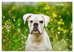April: Weisser Boxer sitzt mitten in einer Blumenwiese.