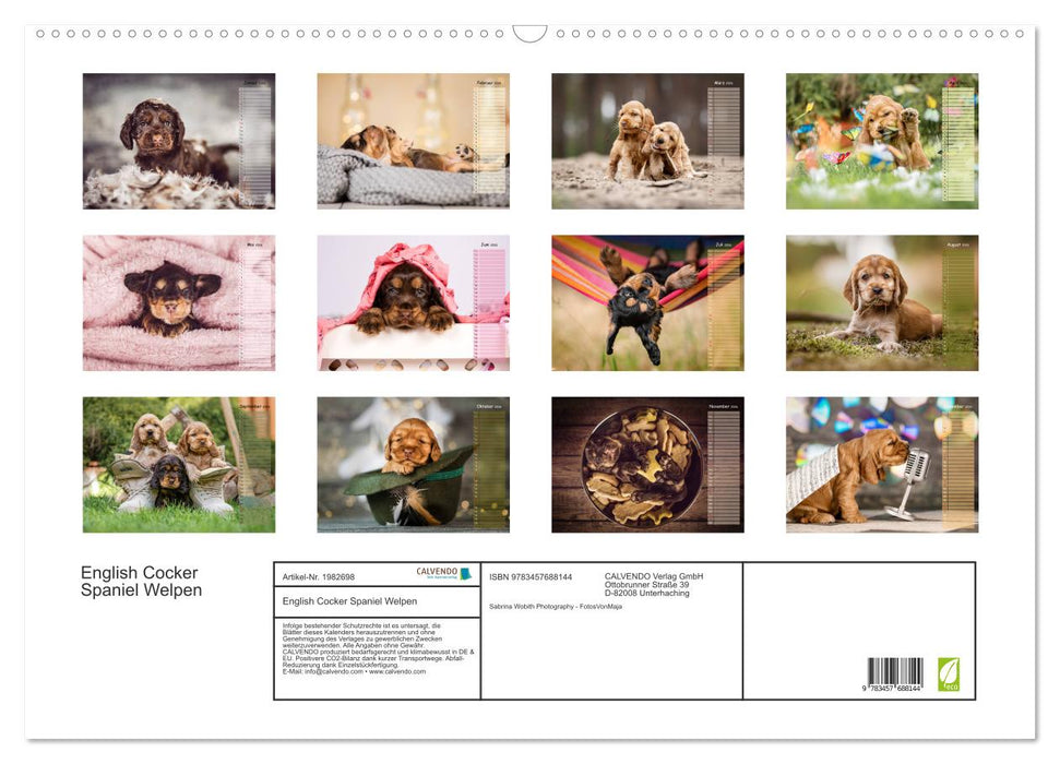 Ein Monatskalender mit English Cocker Spaniel Welpen fotografisch von Sabrina Wobith Photography in Szene gesetzt. Eine Notizfunktion zum eintragen von Terminen oder Geburtstagen ist gegeben. Erfreuen Sie sich auf ein zuckersüßes Bild jeden Monat.