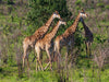 Majestätisch und elegant ziehen die Giraffen vor dem satten Grün der afrikanischen Büsche vorbei. Dieses Bild fängt die anmutige Schönheit und die ruhige Gelassenheit der Savanne perfekt ein.