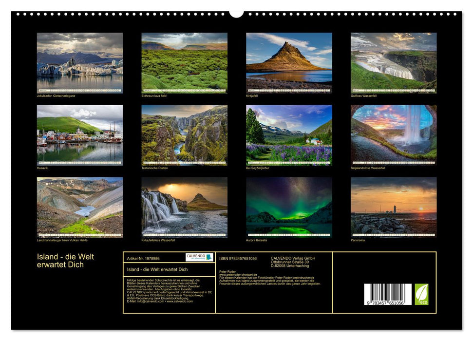 Für diesen Kalender hat der Fotokünstler Peter Roder beeindruckende Aufnahmen aus Island zusammengestellt und gestaltet, sie werden die Freunde dieses außergewöhlichen Landes durch das ganze Jahr begleiten.