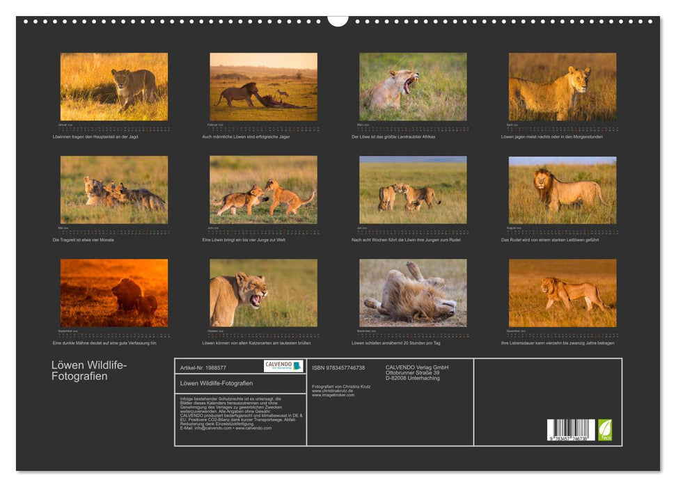 Eindrucksvolle Aufnahmen vom König der Tiere in seinem natürlichen Lebensraum, der afrikanischen Savanne. Dieser Kalender zeigt Wildlife-Fotografien von Löwen und ihren niedlichen Jungen in ihrer faszinierenden Schönheit: wild, gefährlich und kraftvoll.