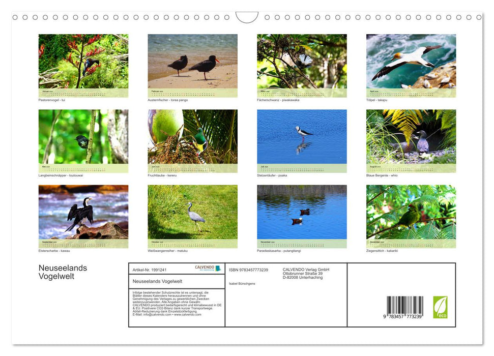 Mit diesem Kalender holen Sie sich jeden Monat einen von Neuseelands beliebtesten Vögeln zum Beispiel in Ihr Büro, die Küche oder das Wohnzimmer.