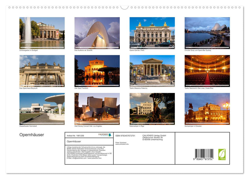 Historische altehrwürdige Gebäude oder spektakuläre moderne Architektur - dieser Kalender vom Reisefotografen Peter Schickert zeigt 12 faszinierende Opern- und Konzerthäuser aus aller Welt.