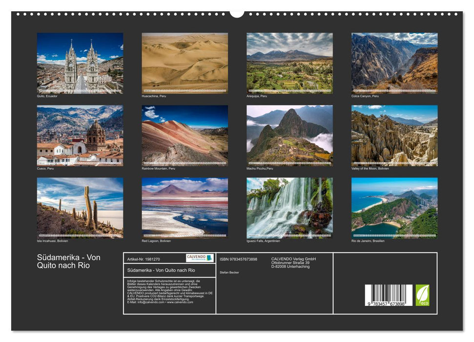 Von Quito nach Rio begegnet der Reisende wundervoller Natur, historischen Stätten und herzlichen Menschen. Dieser Kalender zeigt 12 Highlights auf einer fotografischen Reise durch Südamerika.