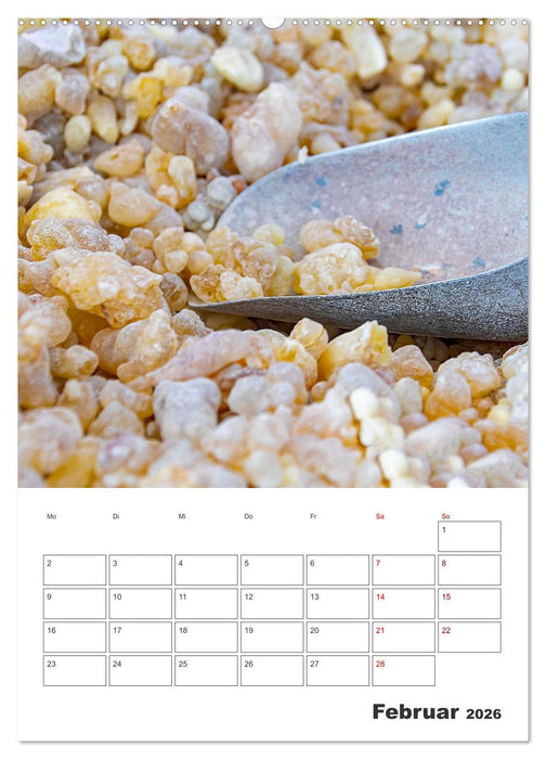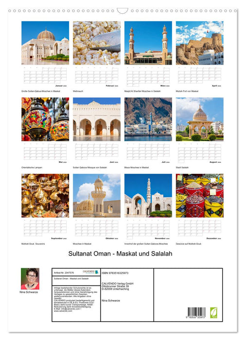 Auf 12 beeindruckenden Bildern zeigt der Kalender die Schönheit der Hauptstadt des Sultanats Maskat am Golf von Oman im Batina-Gebiet und der Stadt Salalah in der Dhofar-Region. Kommen Sie mit auf eine Reise in ein faszinierendes Land aus Tausendundeiner Nacht mit dem Duft von Weihrauch und Gewürzen, atemberaubenden Landschaften und orientalischer Architektur. Lassen Sie sich vom Orient verzaubern.