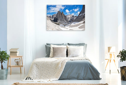 Premium Textil-Leinwand Blick auf die Vajolet-Türme (2790 - 2821 m), eine bizarre Felsformation im Zentrum der Rosengartengruppe.