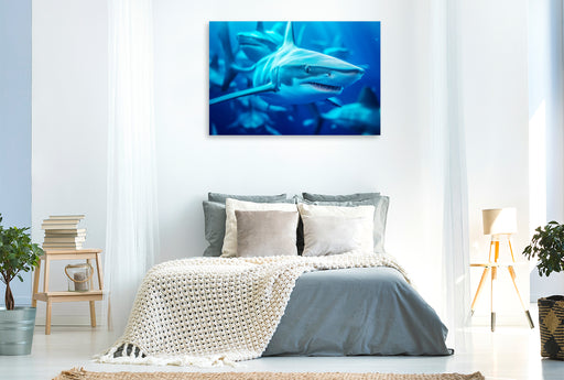 Ein künstlicher Blick auf eine vereinte Hai-Gemeinschaft, die in einem kristallklaren Ozean auf Beutefang geht. In einer von KI erschaffenen Szene...